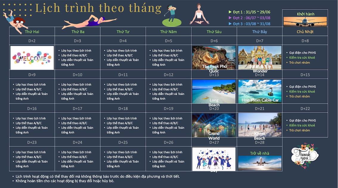 4. Chương trình học tập tại trại hèHọc viên tham gia 11 tiết học/ngày, trong đó có 9 tiết học tiếng Anh và 2 tiết thể thao dạng training session với thầy cô hướng dẫn chuyên nghiệp. Bao gồm lớp 1:1, lớp nhóm, thuyết trình và ôn tập từ vựng. Chương trình học được thiết kế nhằm phát triển toàn diện kỹ năng Nghe - Nói - Đọc - Viết theo phương pháp giảng dạy hiện đại, tăng cường sự tự tin khi giao tiếp tiếng Anh.