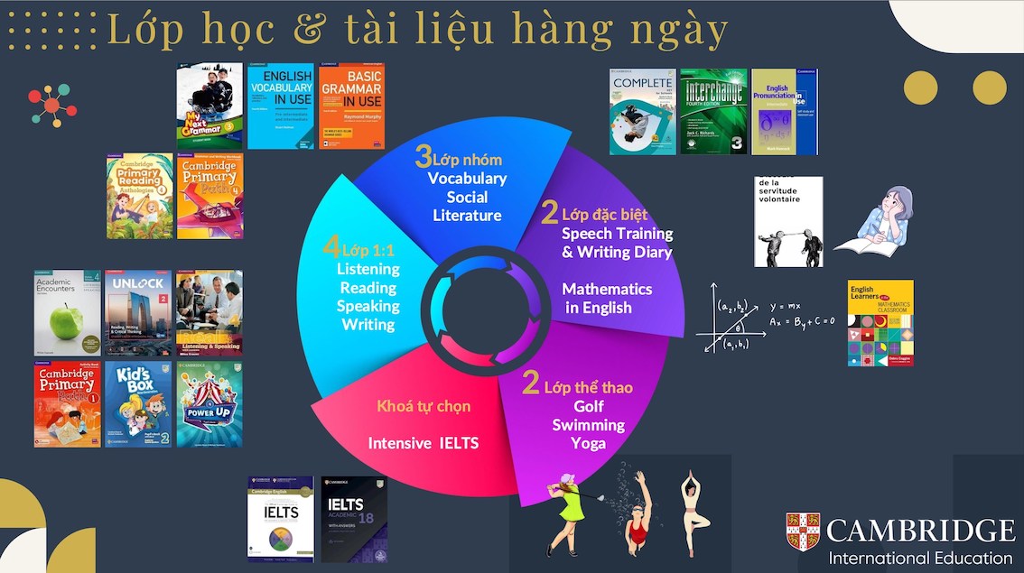 Khu vực giải trí và thể thao: Học viên có thể tham gia các hoạt động thể chất tại khu vực thể thao với sân golf mini, hồ bơi, phòng tập gym và khu vui chơi ngoài trời.