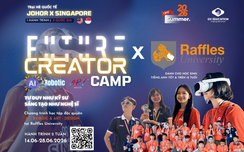 Trại hè Raffles Camp tại Đại học Raffles (Raffles University) chính là lời giải hoàn hảo cho bài toán này. Với hành trình 2 tuần tập trung vào hai mũi nhọn AI & Robotics và Art & Design, chương trình hứa hẹn mang đến một cú "hích" mạnh mẽ, giúp học sinh thay đổi hoàn toàn tư duy thụ động sang chủ động kiến tạo tương lai.
