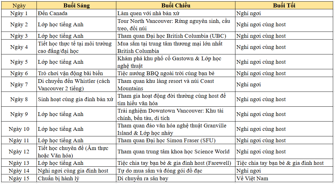 Nội dung chính: Học tiếng Anh giao tiếp, trải nghiệm các lớp học chuyên ngành tại cao đẳng/đại học và khám phá văn hóa, thiên nhiên Canada.