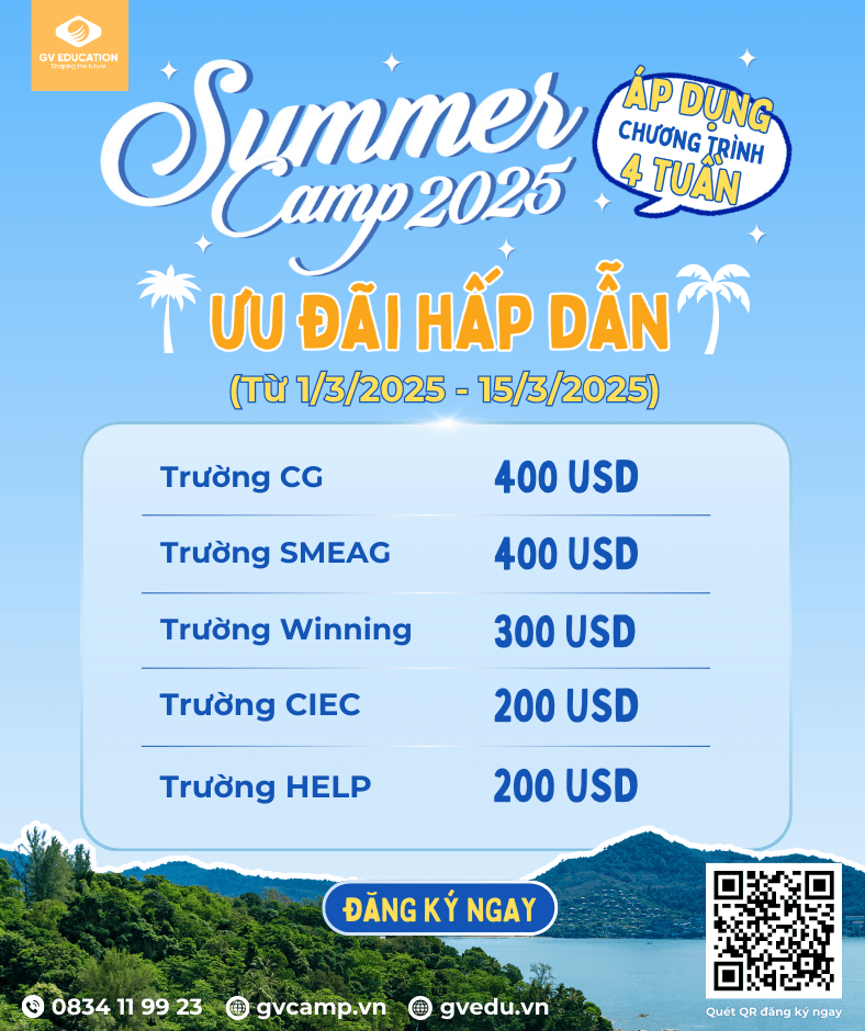 Mùa hè là thời điểm lý tưởng để nâng cao trình độ tiếng Anh và khám phá môi trường học tập quốc tế. GV Education mang đến chương trình ưu đãi đặc biệt dành cho học viên đăng ký Trại hè Philippines từ ngày 1/3 – 15/3, giúp bạn tiết kiệm chi phí và trải nghiệm môi trường học tập chất lượng cao.